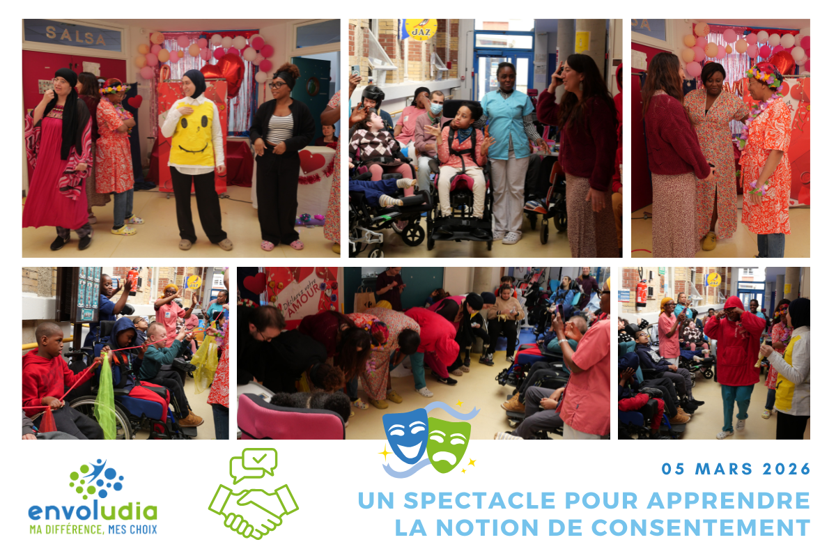 Jeudi 5 mars, en plein après-midi, les jeunes accompagnés à l’IEM Evoludia à Montreuil ont assisté à un spectacle autour d’un sujet essentiel : le consentement